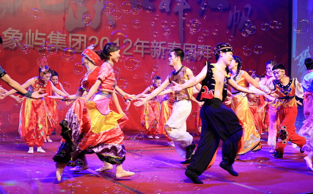 團(tuán)拜會(huì)上,象嶼人自編自導(dǎo)自演的春晚節(jié)目盛大登場(chǎng)。象嶼建設(shè)集團(tuán)獻(xiàn)演的歡慶歌舞《盛世中華》,身著民族節(jié)慶服飾的姑娘小伙們熱情奔放,氣勢(shì)恢弘;象嶼股份火辣的阿拉伯舞《美麗的姑娘賽比古兒》驚艷全場(chǎng),扭轉(zhuǎn),抖肩,甩胯,窈窕的姑娘們盡情地綻放著耀眼的青春;上海區(qū)域選送京劇《智斗》,叱咤上海灘的各位公司高管齊登戲臺(tái),無(wú)論是司令還是阿慶嫂,范兒倍足,調(diào)兒倍正,十足個(gè)性演繹,引發(fā)臺(tái)下叫好不斷;集團(tuán)公司聯(lián)合象嶼資產(chǎn)、象嶼配送、象嶼碼頭、象嶼建設(shè)表演的歌舞聯(lián)唱《歲月如歌》,高中基三級(jí)同臺(tái),老中青三代盡歡,不同風(fēng)格的歌舞串聯(lián),展現(xiàn)的是象嶼文化的包容與開創(chuàng);福建/南平象嶼公司逗趣的《小人舞》創(chuàng)意無(wú)限,傳神的表情映襯恰到好處的肢體動(dòng)作,笑點(diǎn)不斷,而很難想象的是每個(gè)人物都由雙人搭配,紅幕后是團(tuán)隊(duì)配合的默契;速傳物流活潑優(yōu)美的新疆舞《掀起你的蓋頭來(lái)》充滿戲劇色彩,群舞韻律動(dòng)感,對(duì)舞火花擦撞,多情的青年男女追尋著炙熱的愛(ài)情,也寓意著象嶼人勇于追求心中美好的向往。春晚在晨帆合唱團(tuán)歡快的《陽(yáng)光進(jìn)行曲》中成功落下帷幕。團(tuán)拜會(huì)現(xiàn)場(chǎng)歡樂(lè)、祥和,晚宴期間穿插的抽獎(jiǎng)活動(dòng),更讓驚喜的歡呼尖叫聲接連不斷,公司為辛勤一年的員工們準(zhǔn)備的豐厚大禮,掀起現(xiàn)場(chǎng)一次又一次的高潮。