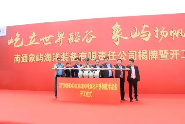 首制船“XY001”號38800噸不銹鋼化學品船同期開工。江蘇省經信委副主任、國防科工委主任秦雁,南通市委常委、通州區(qū)委書記宋樂偉,南通市副市長徐新民,通州區(qū)區(qū)委副書記、區(qū)長陳永紅,華融航運金融租賃有限公司總經理樊旭平,象嶼集團總裁陳方,中海重工董事局主席李明,南通象嶼副董事長朱建華,共同推動38800噸不銹鋼化學品船開工桿!