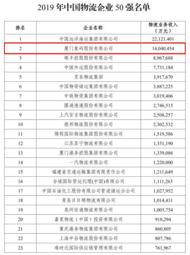 今日,中國物流與采購聯(lián)合會(huì)公布了2019年度中國物流企業(yè)50強(qiáng)排名,象嶼股份蟬聯(lián)第2。