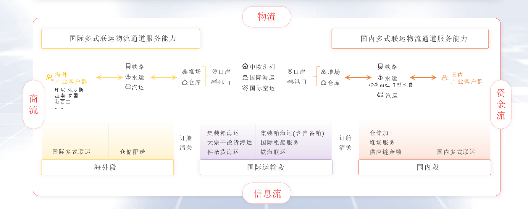 象嶼股份率先構(gòu)建了以“公、鐵、水、倉(cāng)”為支撐,覆蓋全國(guó)、連接海外的網(wǎng)絡(luò)化物流服務(wù)體系,并以“鐵、水”做干線、公路做兩端的經(jīng)營(yíng)思路,為客戶提供定制化多式聯(lián)運(yùn)解決方案,實(shí)現(xiàn)一站式門(mén)到門(mén)運(yùn)輸。目前,公司已經(jīng)打造出“北糧南運(yùn)”“鋁產(chǎn)品跨省流通”“北煤南運(yùn)”等多條多式聯(lián)運(yùn)物流線路。