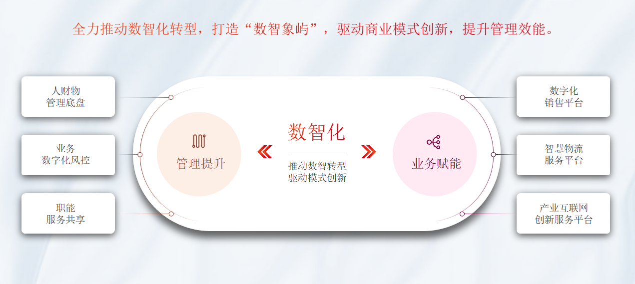象嶼股份依托海量的業(yè)務(wù)數(shù)據(jù)、龐大的客戶資源、豐富的應(yīng)用場(chǎng)景,積極推進(jìn)數(shù)字化技術(shù)與業(yè)務(wù)的有效融合,并已落地農(nóng)業(yè)產(chǎn)業(yè)級(jí)互聯(lián)網(wǎng)平臺(tái)、供應(yīng)鏈金融服務(wù)平臺(tái)、智慧物流服務(wù)平臺(tái)、網(wǎng)絡(luò)貨運(yùn)平臺(tái)4大重點(diǎn)項(xiàng)目,實(shí)現(xiàn)技術(shù)及商業(yè)模式升級(jí)。